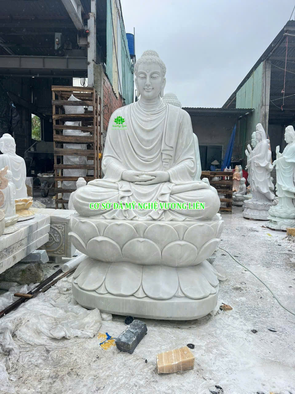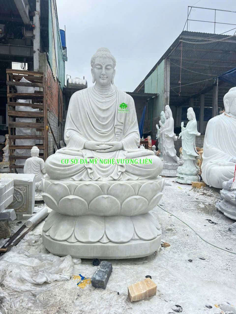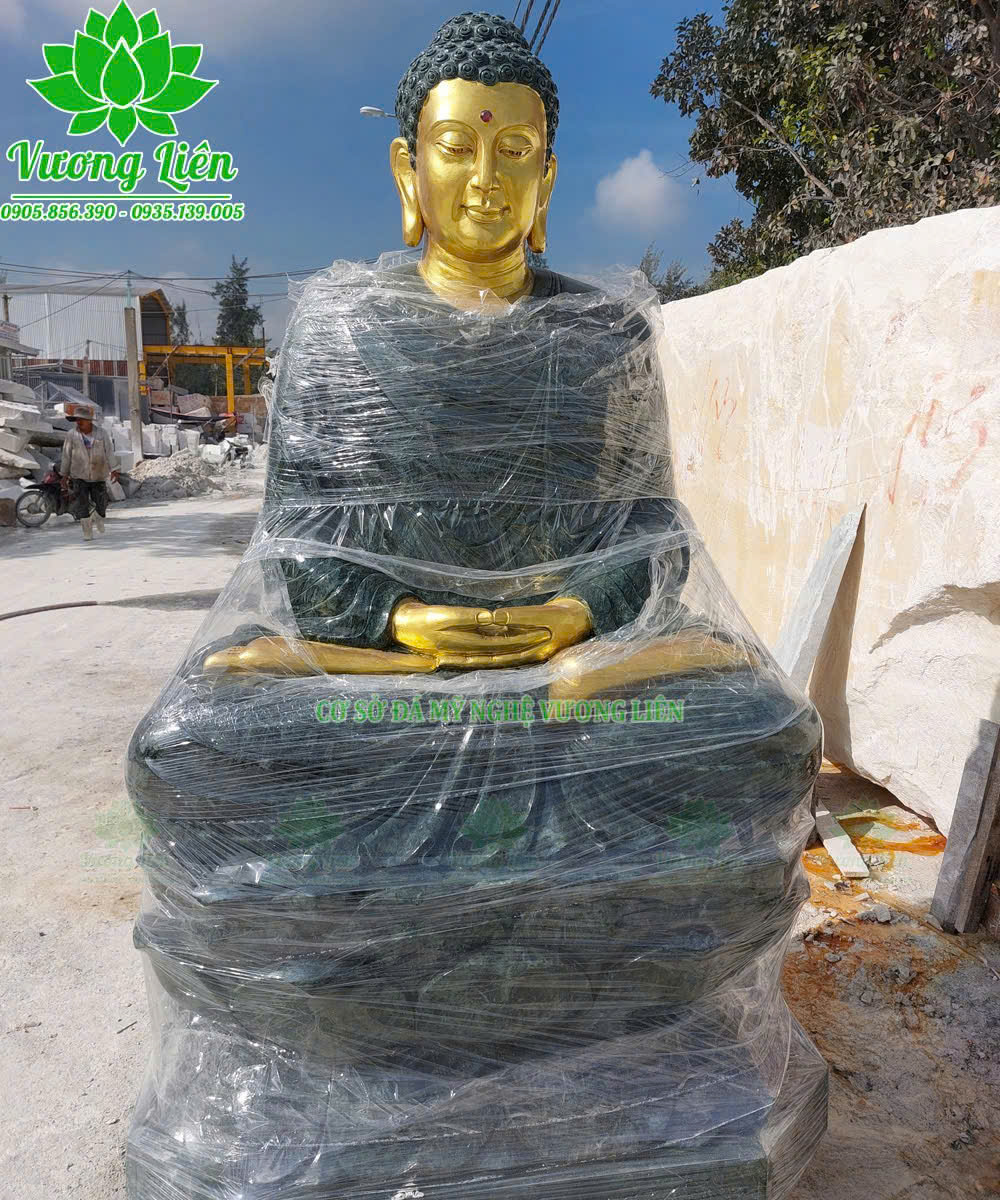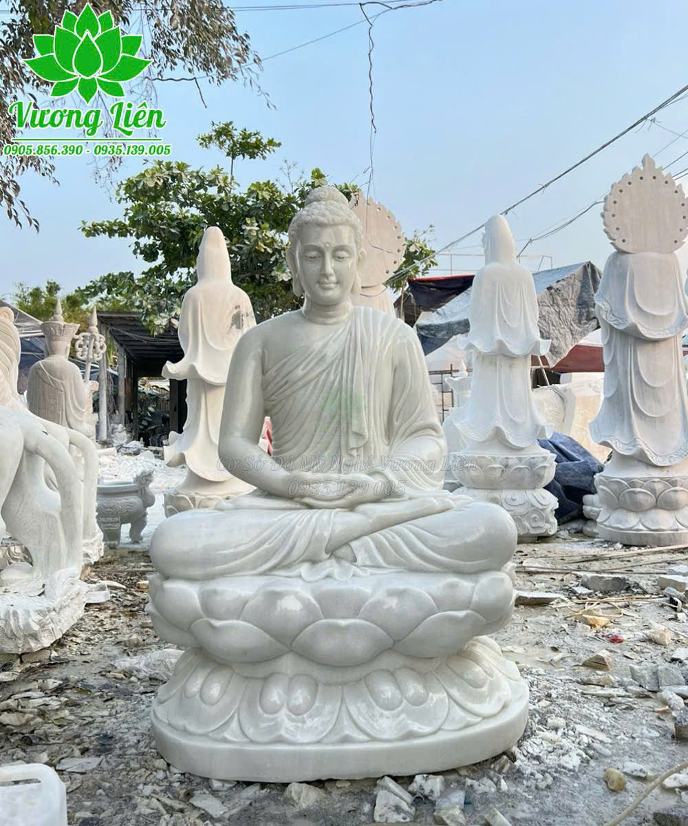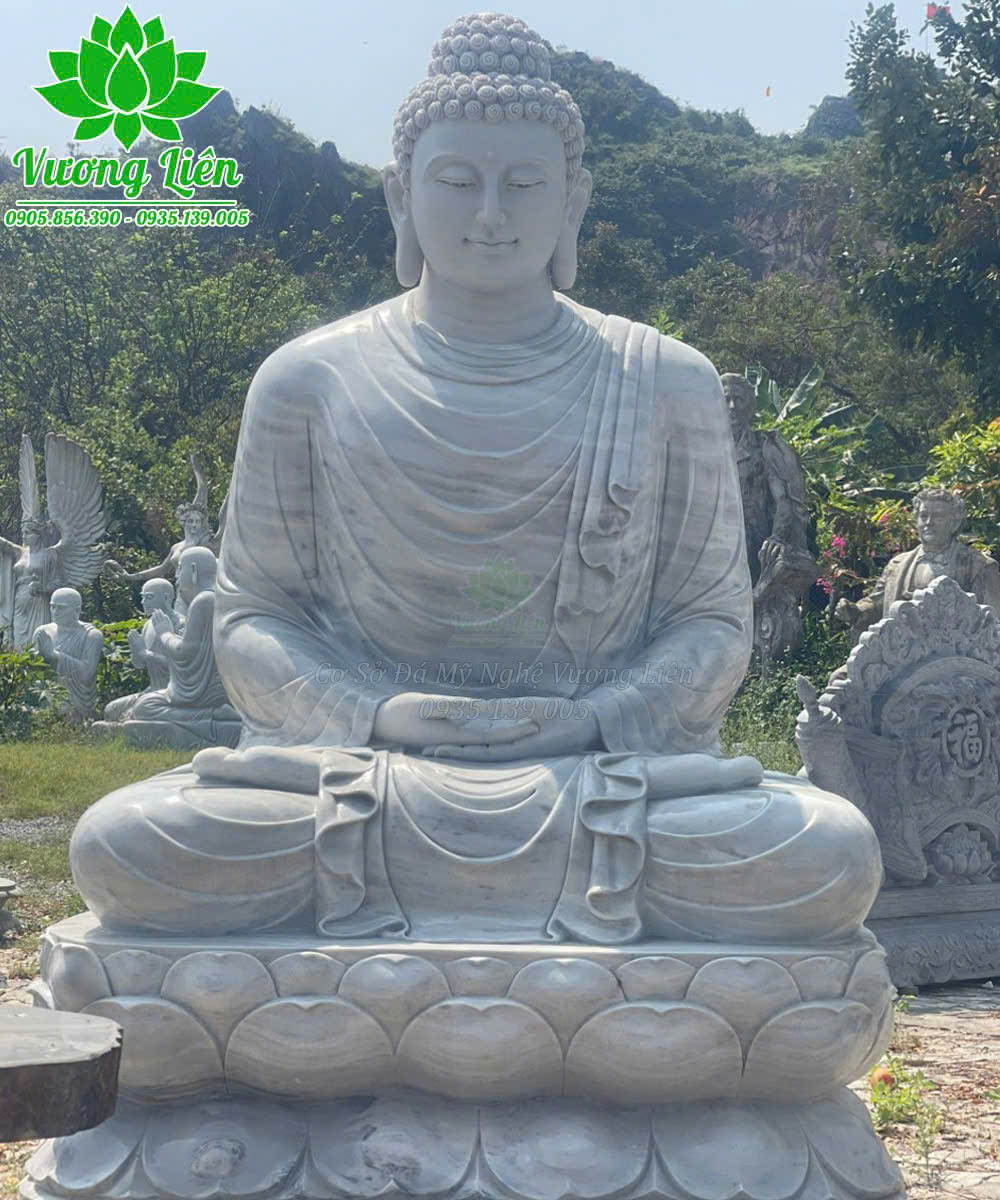 Tôn tượng Đức bổn sư thích ca thiền định, Bậc Thầy của chư thiên và nhân loại. Vì lòng tôn kính Phật bảo nên tập thể cở sở đá điêu khắc mỹ nghệ Vương Liên đã lựa chọn những nghệ nhân dày dặn kinh nghiệm với hơn 15 trong nghề để tạo ra những sản phẩm kiệt tác với mục đích tôn vinh hạnh nguyện cao thượng của Bậc giải thoát, Bậc Thầy của chư thiên và nhân loại. Kiệt tác Kim thân Phật thiền định được chế tác bởi chất liệu 100% đá tự nhiên nguyên khối (hoặc quý khách có thể chọn lựa theo yêu cầu đá cẩm thạch, đá sa thạch hoặc đá xanh Ấn). Đặc tính đá được chúng tôi lựa chọn kỹ lưỡng bao gồm cả yếu tố chất và lượng như màu sắc đá lẫn độ nguyên khối. Khối đá không rạng nứt, độ bền bỉ chống chịu tốt với các yếu tố bất lợi của ngoại cảnh, vân đá tự nhiên, vẻ đẹp bóng bẩy, màu sắc đồng nhất.